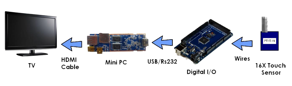 Multimedialny układ sterowania, służący do prezentowania filmów reklamowych, w którym odbiorca za pomocą zbliżenia dłoni do typu produktu, ma bezpośrednią możliwość wyboru materiałów reklamowych na monitorze.