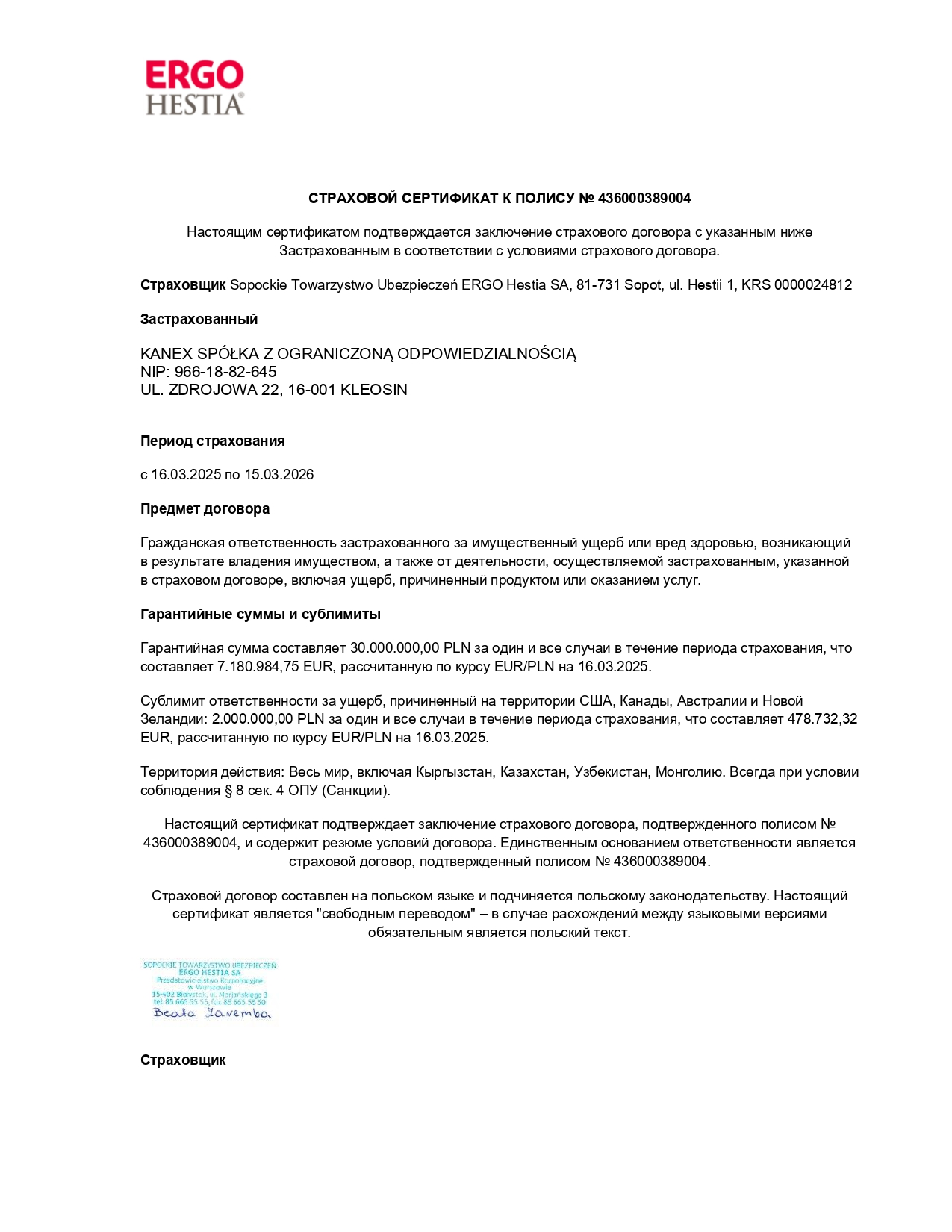 Компания KANEX застрахована на сумму 7,013,278 EUR что обеспечивает удовлетворение возможных претензий, вытекающих из гарантийных условий.